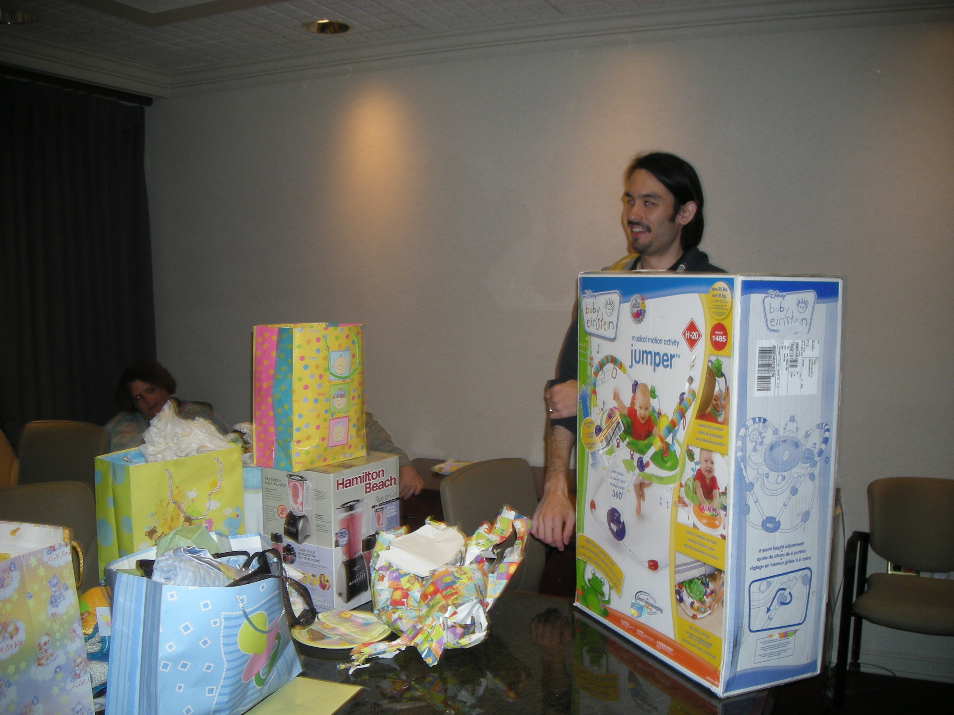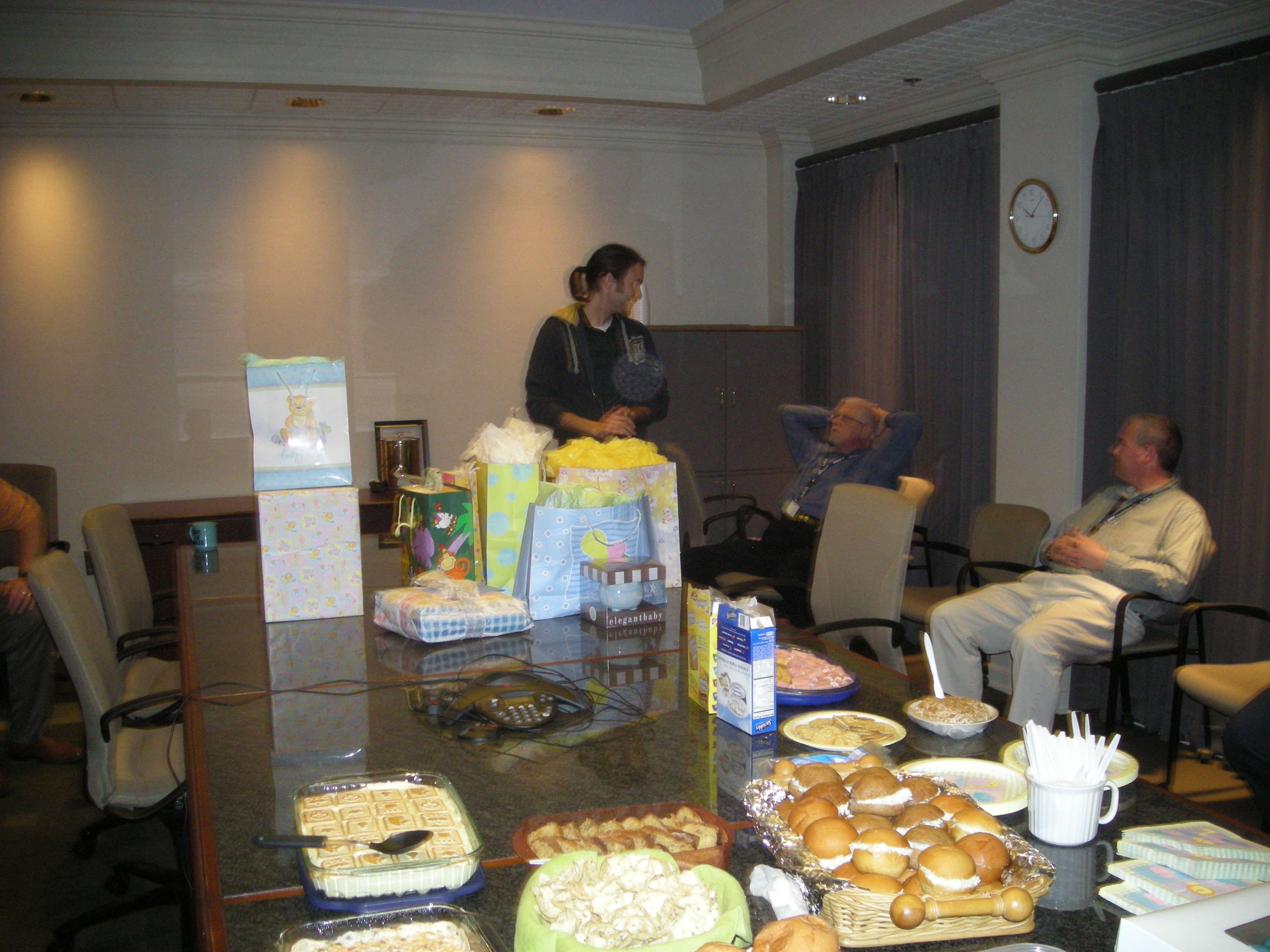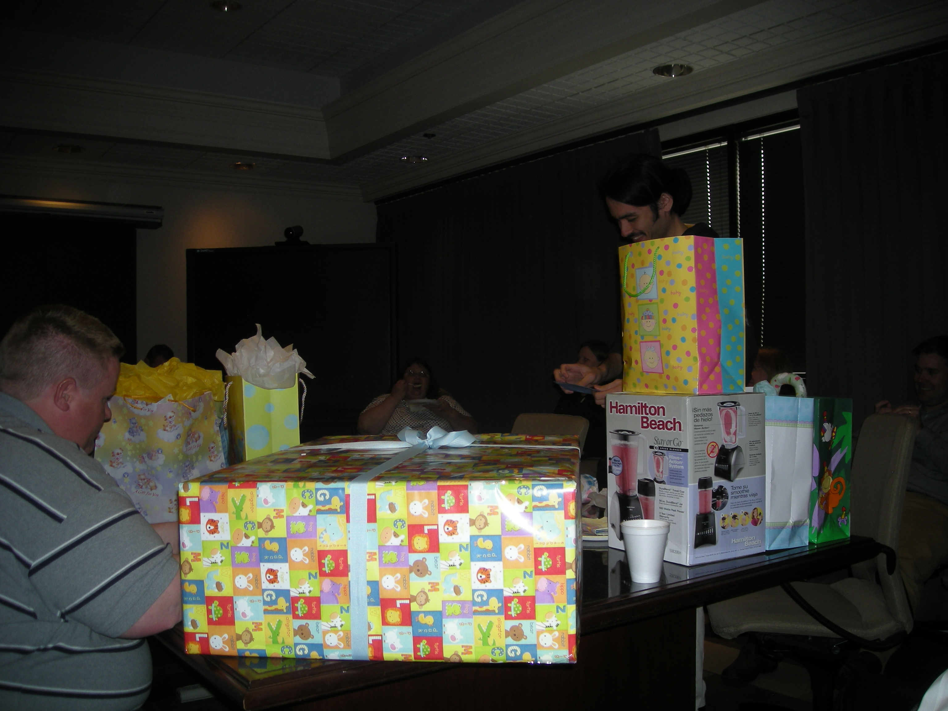 yesterday paul was called into a meeting. when he got there, it turned out that his coworkers had thrown him a surprise baby shower with food and party plates and a ton of gifts. im so glad that paul got to be a part of some baby stuff for him and not just everything being centered around me all the time. we got a ton of stuff: a jumper activity center, a handmade quilt (i almost started crying when i saw it), a playmat that turns into a cart cover, a diaper bag, 4 receiving blankets that are super soft, a bib, two outfits, a toy frog that makes funny noises, a ceramic piggy bank full of money, a huggies gift pack, a toy security blanket with bunny head, and a blender (i registered for that for me and didnt think anyone would actually buy it for me lol).