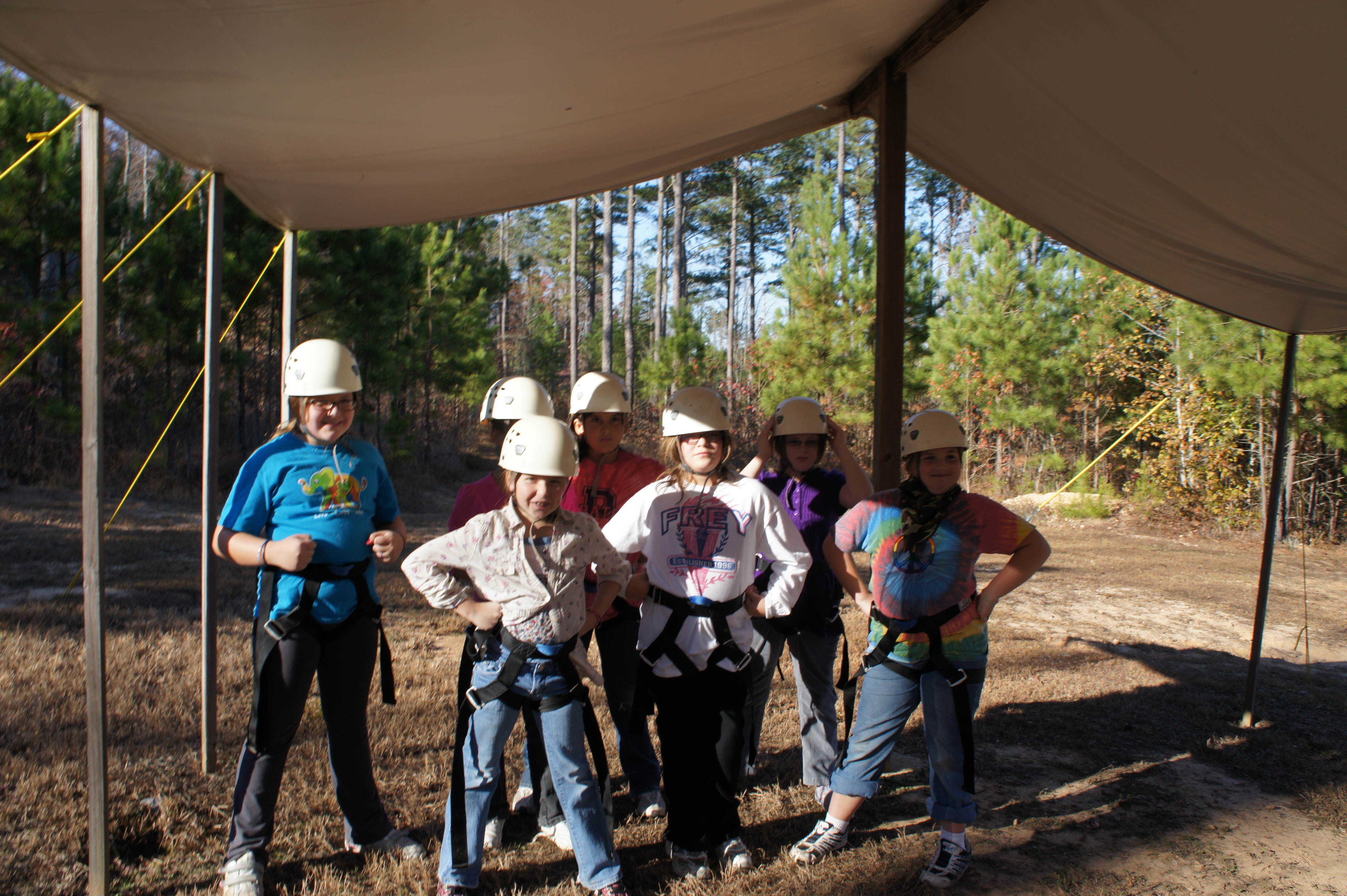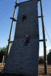 Next we hiked out to the rock climbing wall. I wasn’t able to do this one with them both because of a hurt knee and I don’t think I have the upper arm strength to pull myself up it. The girls were scared of it at first, but each turn that they took they went a little bit higher until two of them even made it all the way to the top 50 feet in the air! It looked really hard, especially since some of the hand holds spin on you making it hard to grab on.
