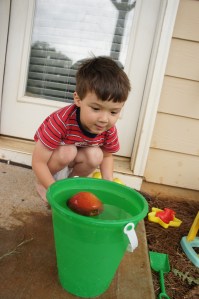 Next we did a science experiment to learn if an apple would sink or float when dropped in the water and recorded our results by gluing a little paper apple onto a picture of a bucket of water. I had him bob for the apple to take it back out of the bucket. He couldn’t get it so he used his hand to turn the stem up into his mouth and pulled it out by the stem.