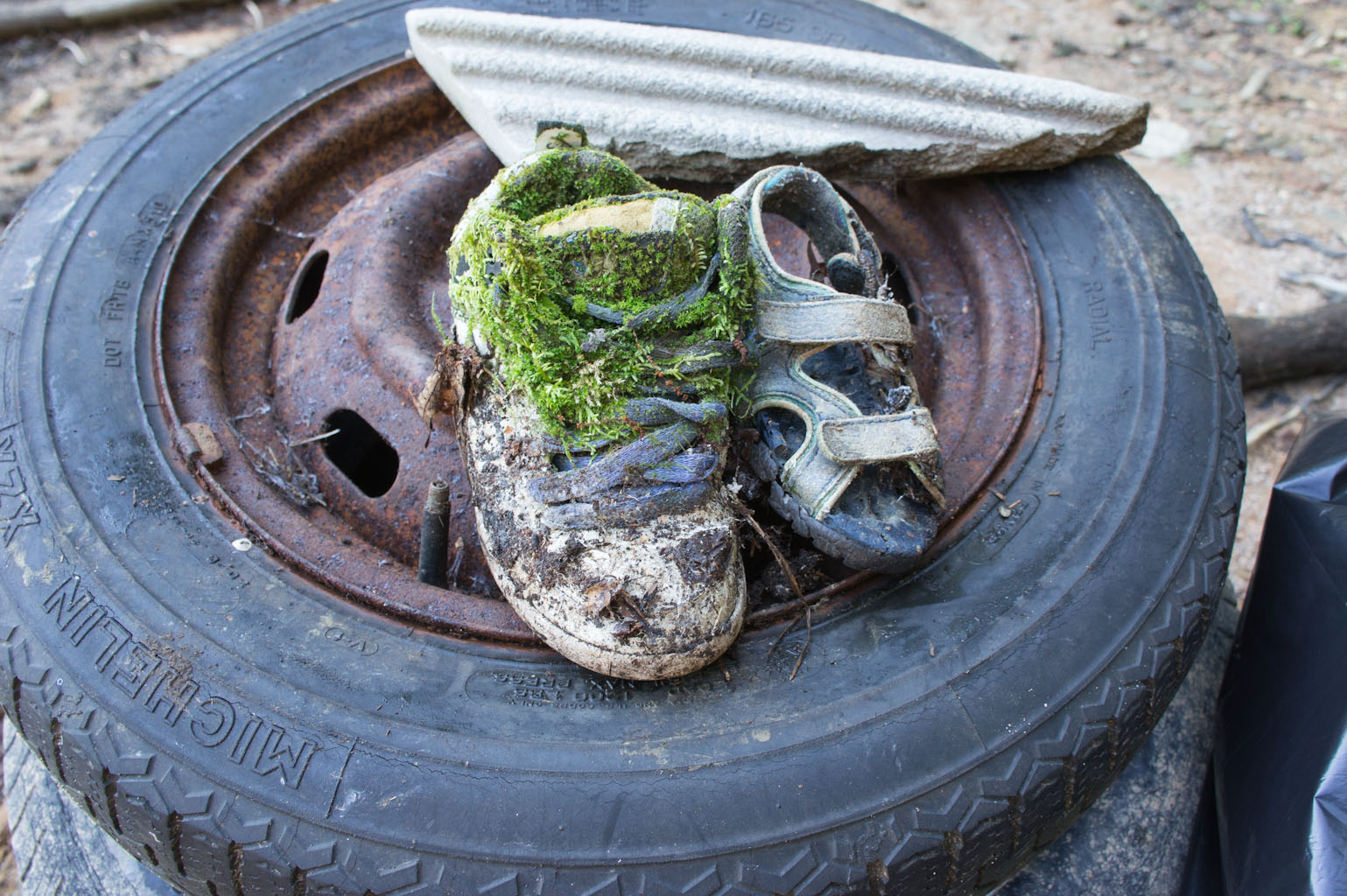 It was very rocky; we climbed over fallen trees and driftwood and all over the place trying to find trash like a dirty Easter egg hunt. And unfortunately, we found a lot of it, including: a tire, a second tire that still had the metal wheel part inside, two hats, TWO SHOES (for those of you that know my thing about lost shoes…*I* was the one that found TWO shoes on the side of the lake), a toothbrush (??), and a ladder.