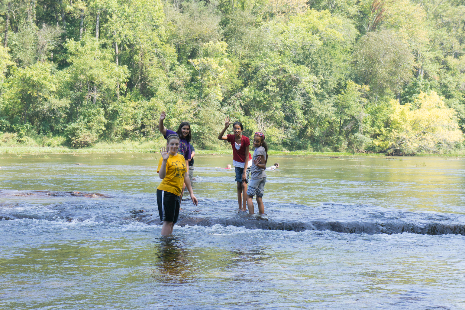 We trekked out into the middle of the creek; this was a *lot* harder than it originally looked because the whole creek bed was uneven rock so finding steady footholds was hard. After a couple of slips, the girls gave up trying to stay dry and just sat down in the water. The water even swept Heather over backwards down a 6 inch waterfall like a White Water slide. In fact, some other kids were purposely riding the waves like that.
