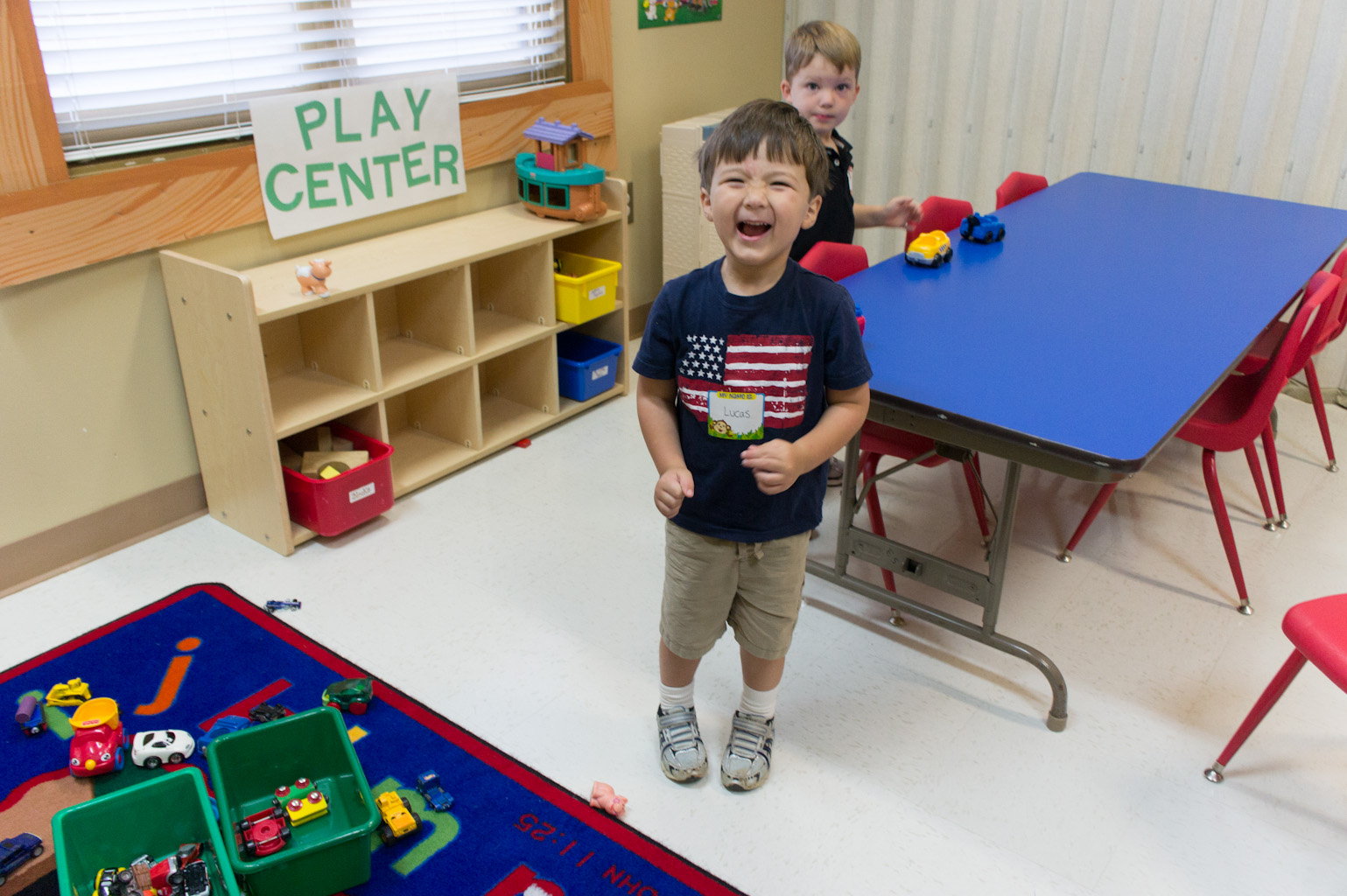 I asked him what he did today and he actually answered me! Usually he will just tell me one mundane fact like, “I drank from the water fountain,” and never what he actually learned. Today he told me they learned about yellow. He told me that the kids danced and the teacher danced but that he didn’t dance because he was nervous. He said they didn’t go on the playground (disappointed voice). I figured they wouldn’t today because it had rained this morning and it was all wet, so I asked him if he got to play with the toys in the classroom instead and he brightened up and told me he did “lots and lots”. He said he played with the other kids, too. He said he had fun and did want to go back.